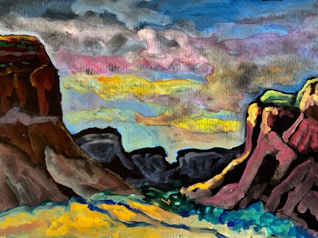 I had a good run painting at Canyonlands and this sunset is the last one I completed there. This compositional structure (buttes on both sides that contrast with interior canyons which recede into the distance) became on of my favorites. It somehow feels right that it is used in my first and last Canyonlands paintings.