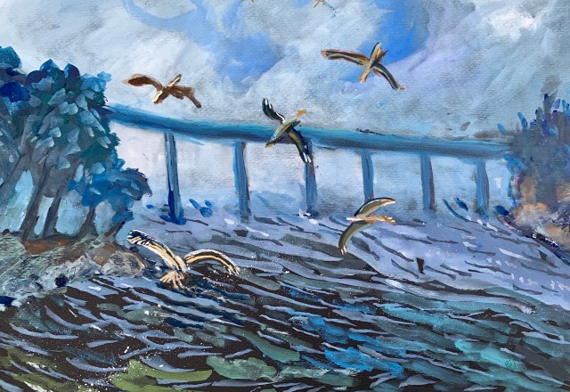 Most of this was painted on the spot but I did not have enough courage to do the birds there. Instead I came home and used my photos since I was uncertain of what the gulls really look like when flying.