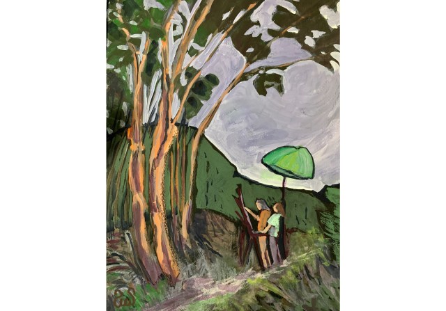 Art Lesson under the Eucalyptus TreesWe painted under eucalyptus trees today, with a gray sky and gentle lighting. My friend stood on the uneven hill a little ahead of me. I did not initially intend to include her but when another in our group came along and I watched them considering the painting and the trees, I was struck by how special a small moment can be and quickly sketched them into this painting.