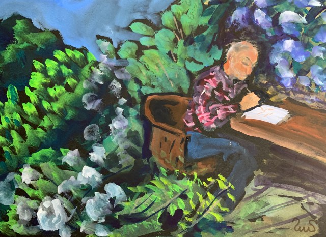 One of us graded and one of us sketched this Sunday afternoon. Our plumbego has made its way down the hill and over the patio, creating a place that calls out to be enjoyed.