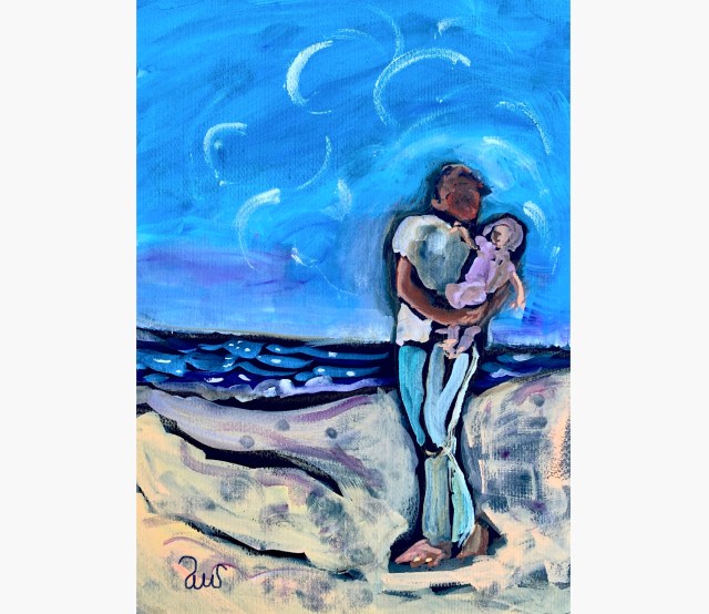 I was finishing up a painting this morning at Coronado Beach when I noticed a man with a baby walking towards me. I was charmed by the way they were interacting and the way the man was carrying the child. I was able to get their outlines down before they passed me. Then I did my best to complete the sketch, pretty much using detail from other beachcombers.