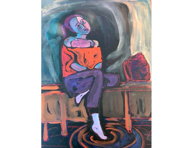 Our model yesterday wore a bright orange top that she wore pulled down from her shoulders. The orange was reflected on her skin but I never quite got a blue for the skin’s shadows that I really liked. I eventually tried some turquoise blue, which you see above.