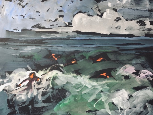 Yesterday at Windansea Beach I did several quick sketches of the surfers and the sea. My goal was to quickly show the colors and movement of the surfers and sea.