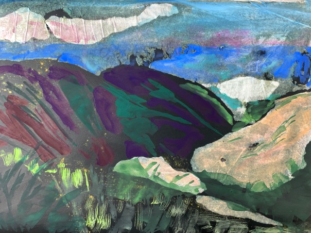 This one is a little different for me. I have been experimenting with tissue paper and tracing paper collage, it is a different way to show what I see. And I like the feel of making shapes by ripping paper. So far I have used tracing paper and tissue paper on black watercolor paper with gouache. The tissue paper can dissolve into the gouache, giving more texture than either alone.