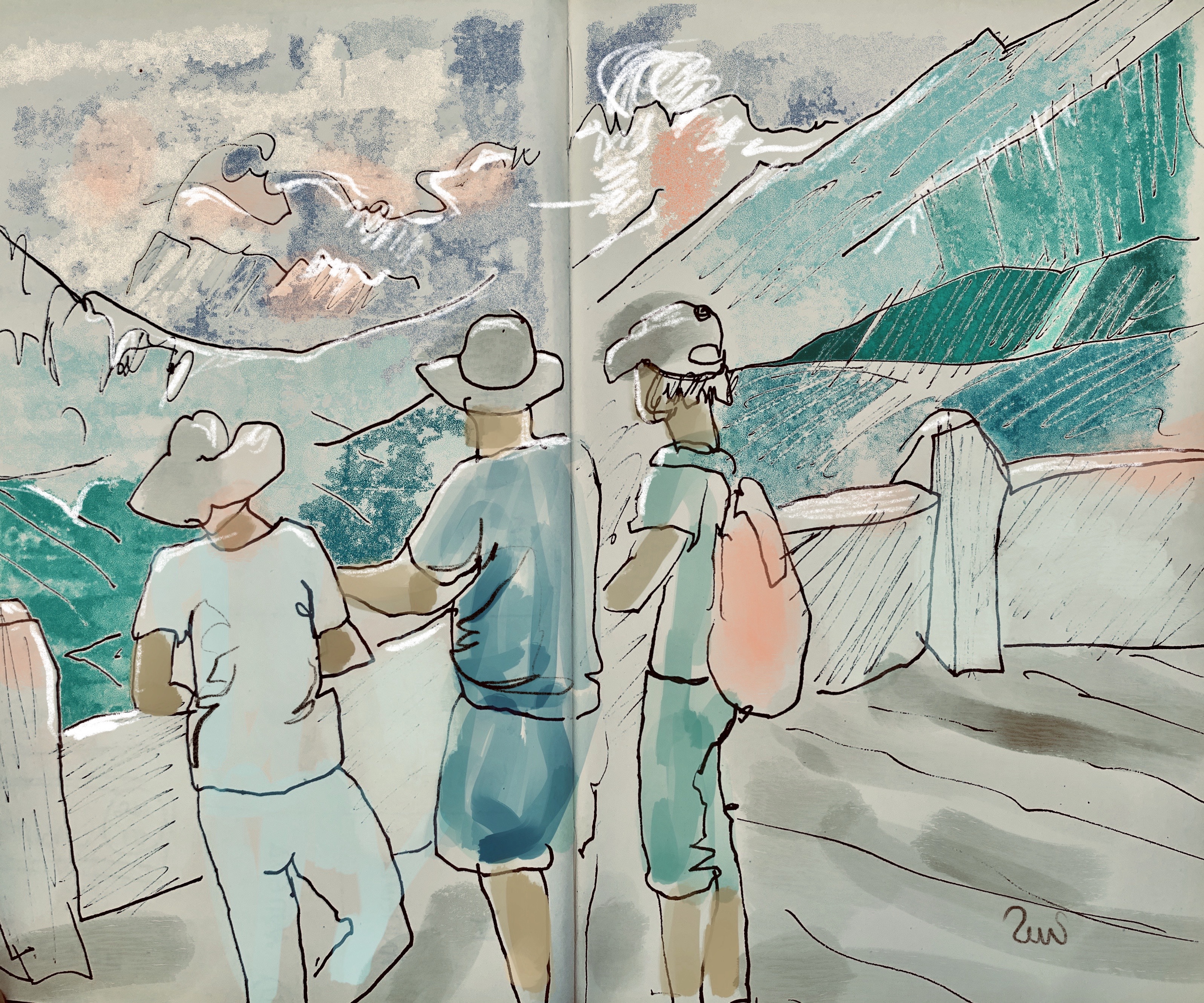 We climbed up to the Cerro de la Cruz in Antigua to get a view of the city and surrounding mountains shortly before sunset. I did not bring any paper but after chatting with a sketcher from Brazil, I was invited to add a quick sketch into her book.