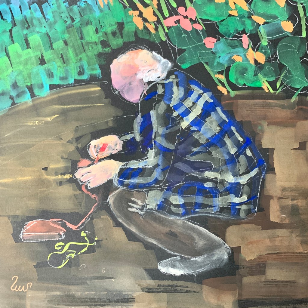 This sketch shows my husband working to set up a solar panel, a project he has been meaning to do for several years. I reorganized my art supplies, cleaned closets, and played with my hula hoop. And who knows, maybe I will even weed that bed of nasturtiums you see in the background.