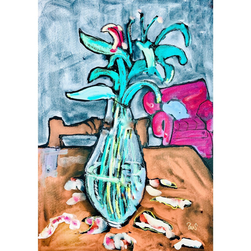 I love this ! I often do this , leave flowers until the last minute to throw them away . Was this painting small Sarah ? I like the way you do lots of small paintings in the time you have for art . I am halfway through painting some large canvases and they take a couple of weeks to finish – but I’ve also started an art journal and I can do intuitive mixed media pieces in about an hour . Very soothing g for the nerves .