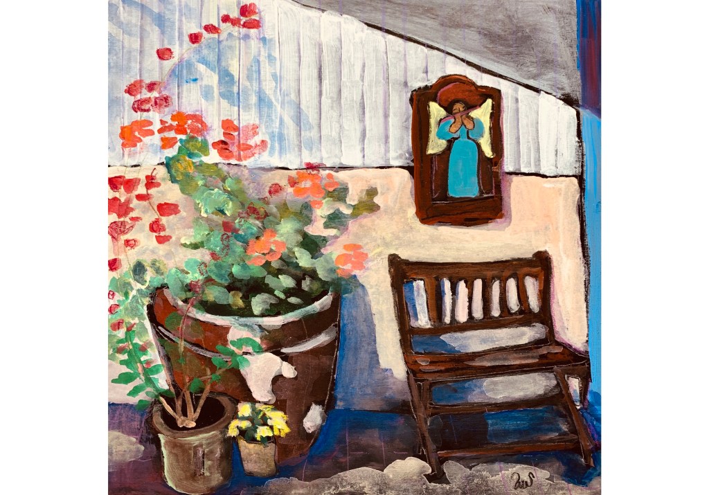 The angel is a piece my father carved and painted. He gave it to us some twenty years ago and it has stood at the front door with a matching angel all this time. To me it says something like, “Enter this home with peace in your heart.”