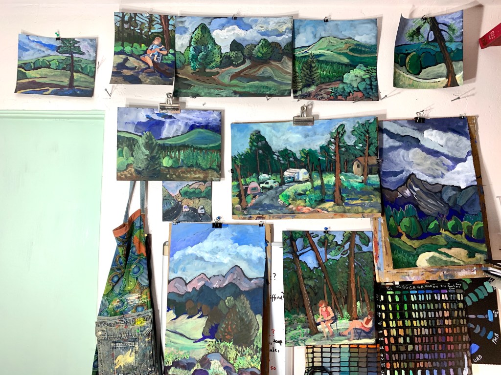 When I look at the collection above of the plein air paintings that I did on our recent trip to Colorado, I notice that I am reluctant to include people in the landscapes and to use vivid accent colors. Since it seems likely that we will continue to shelter in place in San Diego for some time, this month seems like a perfect opportunity to practice these two skills.