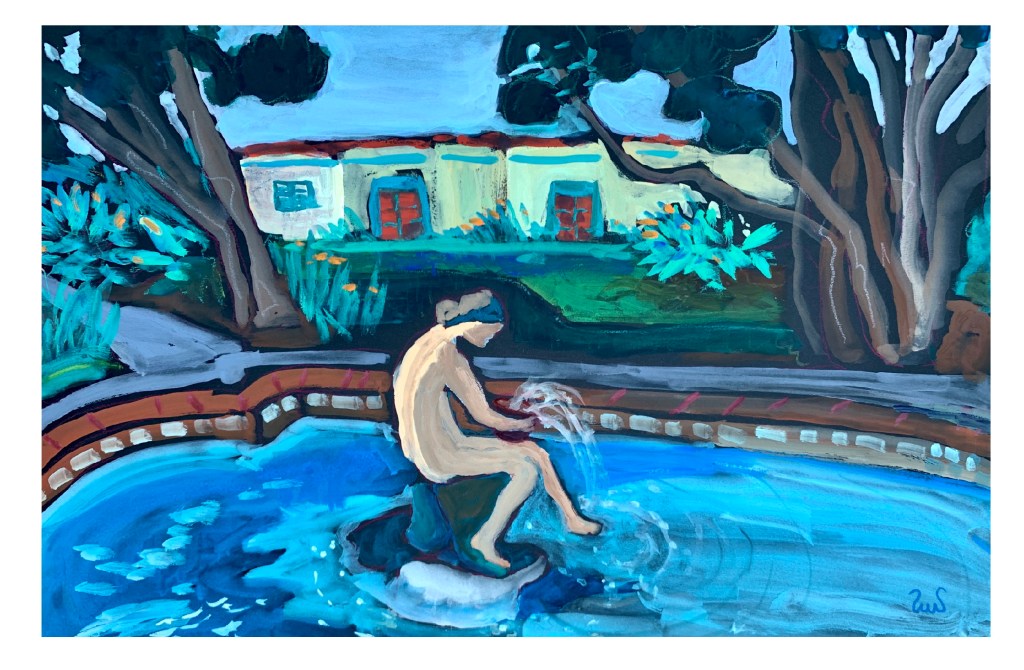 The challenge was painting the statue of the nymph in the center of the pool, who looked like a baby playing with water. I ended up with a dreamy young woman. Regardless, it was a treat to be there painting.