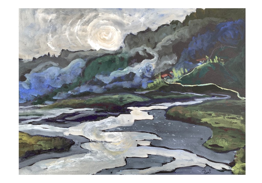 The sun, masked by fog, was just showing above the hills, and much of the landscape was in murky shadows. The water was two-toned, bright with reflected light and a contrasting indigo blue. I worked quickly, but even so, there were significant visual changes as I went along. For instance, the trees’ edges began to light up, and the water’s color shifted from gray to blue.