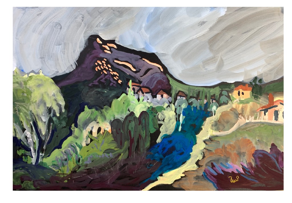 I painted near Lake Hodges today, just north of San Diego. We are nearing the end of our dry season and the water in the lake is nearly gone, but even so, the foliage is greener than most of the non-irrigated parts of Southern California. There some homes along the ridge above the lake and I liked the way they sat above the greens of the dry lake bed.