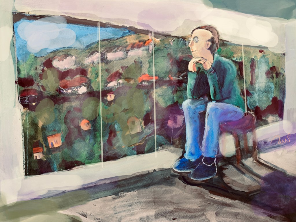 As I did a warm up sketch of our model for today’s Tuesday night Zoom group, I thought he looked like he could be thinking about the stay-home order as well. So, for my second sketch, I drew over a discarded landscape of mine, thinking I could make it seem like he was looking out the window. My goal was to show the feeling of being separated from the world beyond our homes.