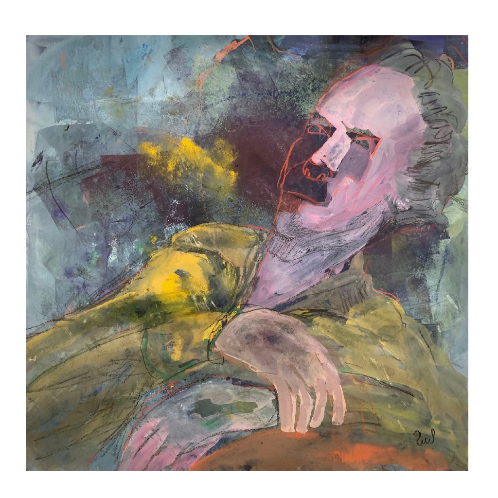 Despite the great outfit, my first sketch was tight and awkward, so I abandoned it and started this second one. I focused only on his face, made some lines with red pastel chalk, and liked how the lines contrasted with the pink face.