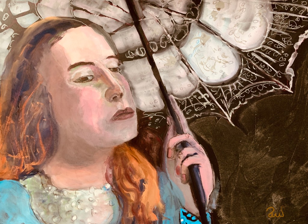 Even more difficult than the expression, was the parasol. By the time I finished the Zoom session yesterday, it was a big mess. I spent a lot of time today trying different marks to make it look like lace. I ended up drawing over the gouache areas with gray ink.