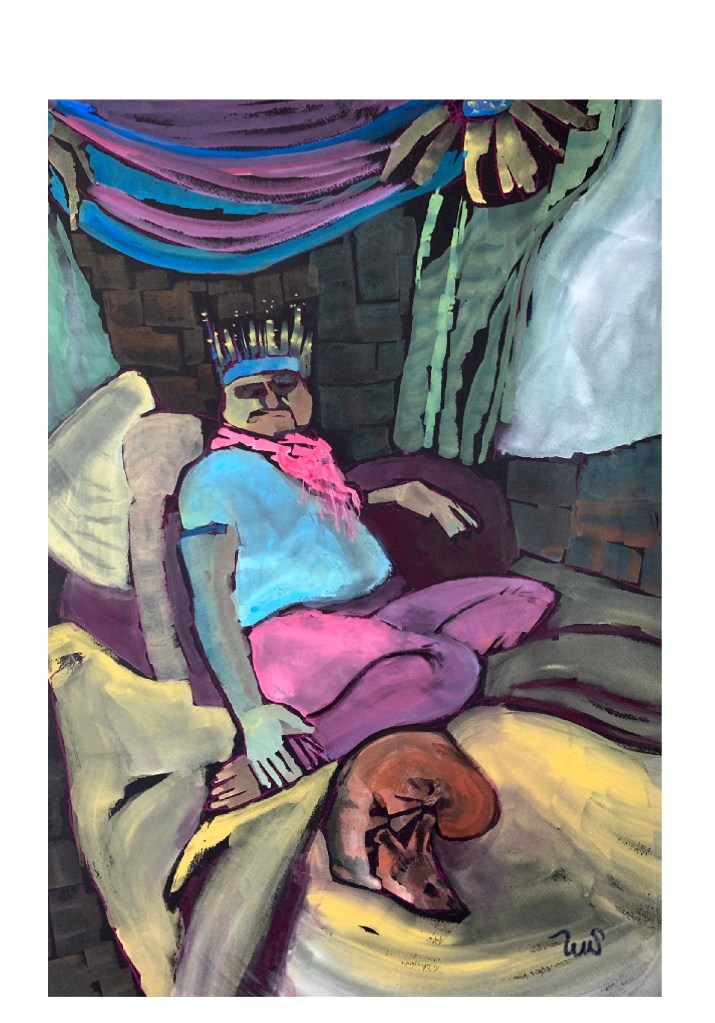 The Tuesday evening Zoom model wore a crown and sat with his dog on his bed, surrounded by drapes and pillows. The colors were bright and suggestive of the energy of spring. The model, however, looked sleepy, as though he might enjoy the pace of winter, just a little longer.