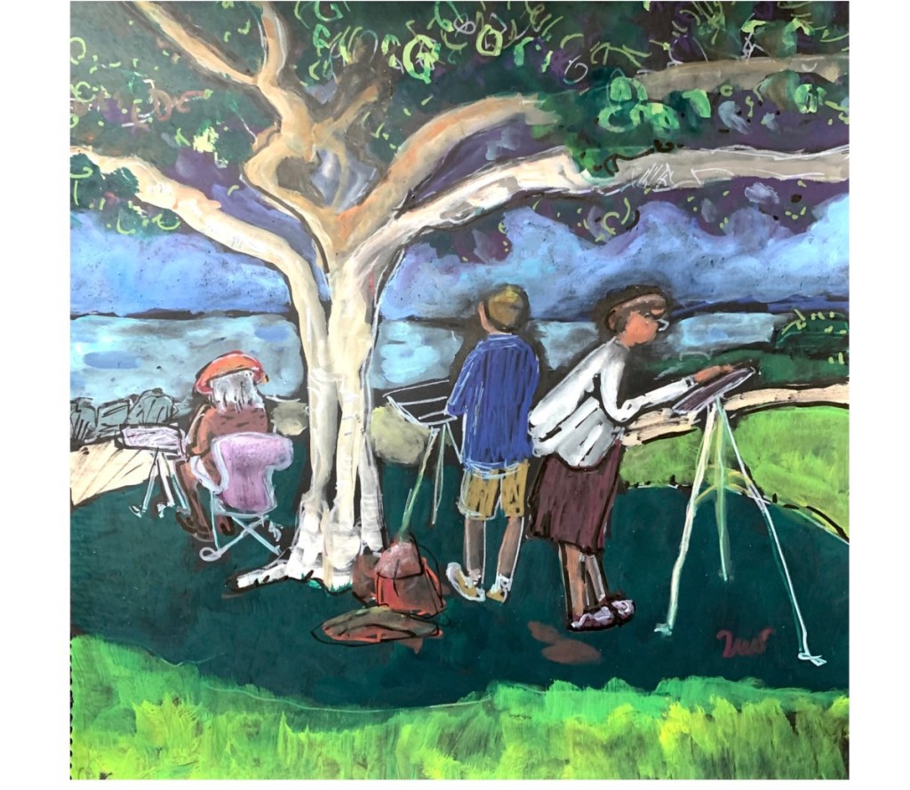 I met up with friends to paint at San Diego’s Shelter Island. This time of year, the sun is hot, and we pretty much need to stand in the shade when painting. I was in the shadows of the next tree over and about to paint the harbor. Then I noticed the adjacent group. Although they huddled under the same tree, each artist was turned and capturing a different slice of the surroundings. I thought their positions said something interesting about the group’s individuality. I also liked this scene because it conveys our local story of loving to be outside painting even as we do our best to stay hidden from the sun