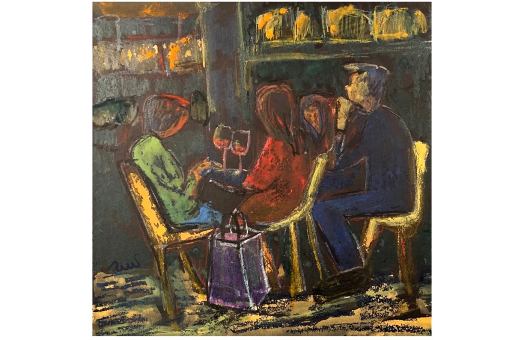 This sketch is a continuation of yesterday’s post, looking a little more to my right. I thought the rich deep colors of the hotel lobby seemed to cast a mood on the people sitting at that table.