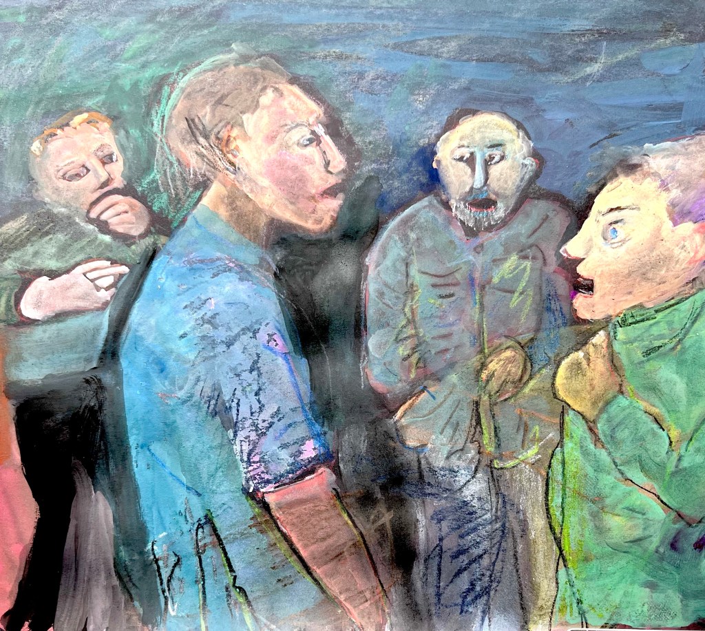 This sketch shows people talking together after a group dinner. I like the expressions on their faces. I drew with crayon and then later added gouache over most of the page.