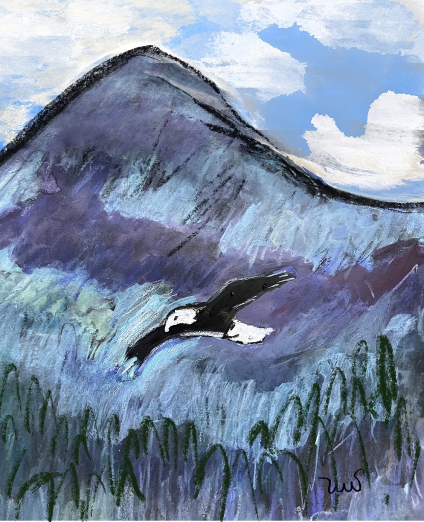 We were hiking late in the afternoon near Molas Lake, Colorado, and noticed a large black and white bird soaring high over the lake. The sweep of the bird as it arched above us was mesmerizing, and we took several photos and videos before it flew away. Then, feeling incredibly lucky, I used a photo and watercolor crayons to draw the bird against the mountain top. Later, looking on the internet, we decided it was a bald eagle.
