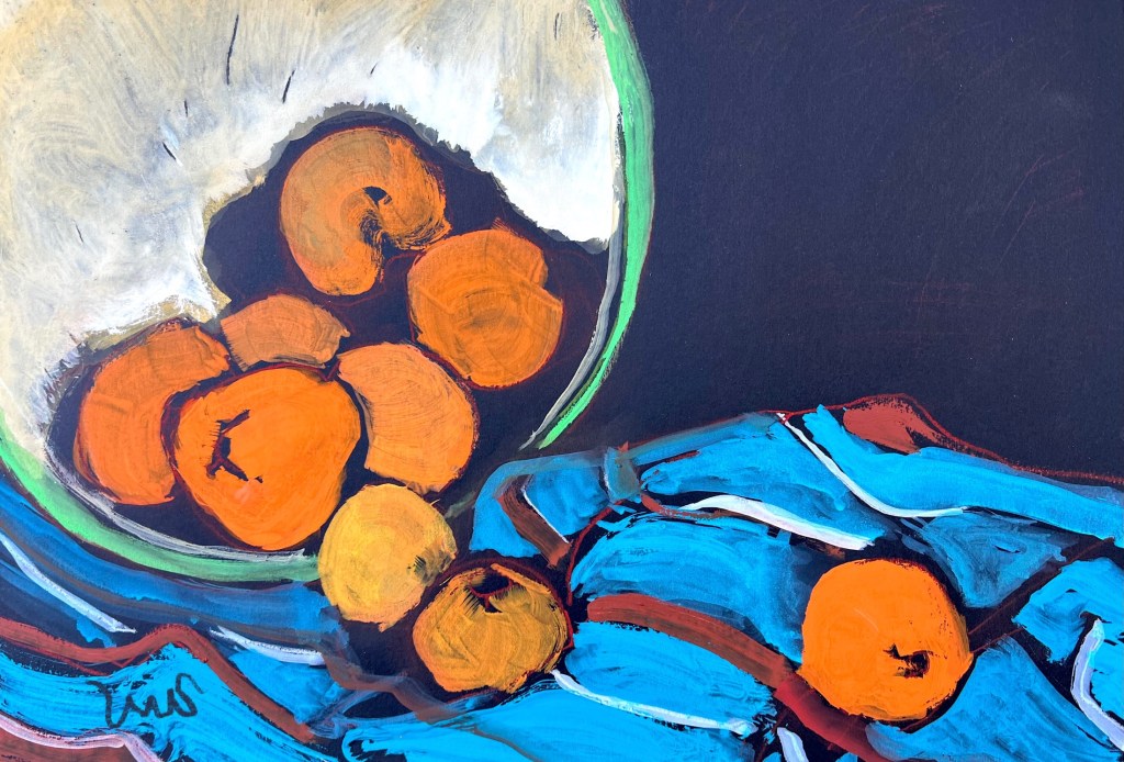 I started with a bowl of oranges on a blue tablecloth but ended up tipping the bowl against the wall, rumpling the tablecloth, and spreading a few oranges across the table. I think it was a good setup because I had fun painting it and the other paintings were terrific.