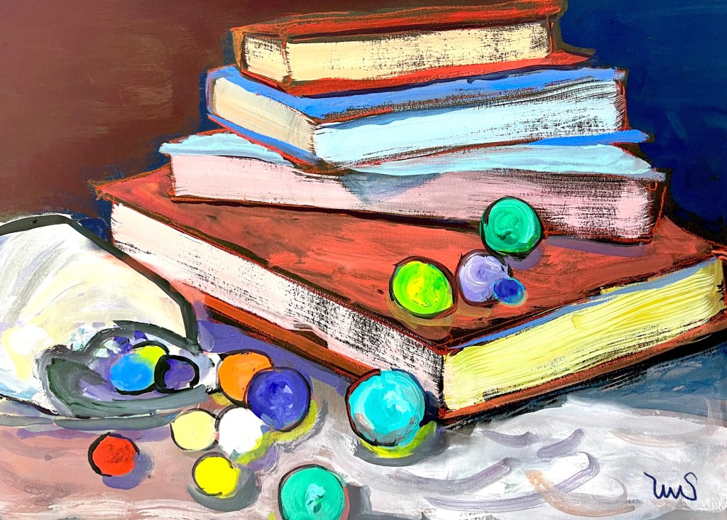 It’s Tuesday, so our group of artists met on the internet to paint a still life scene together. The contrast between the rectangular books and marbles made this a fun sketch to make.