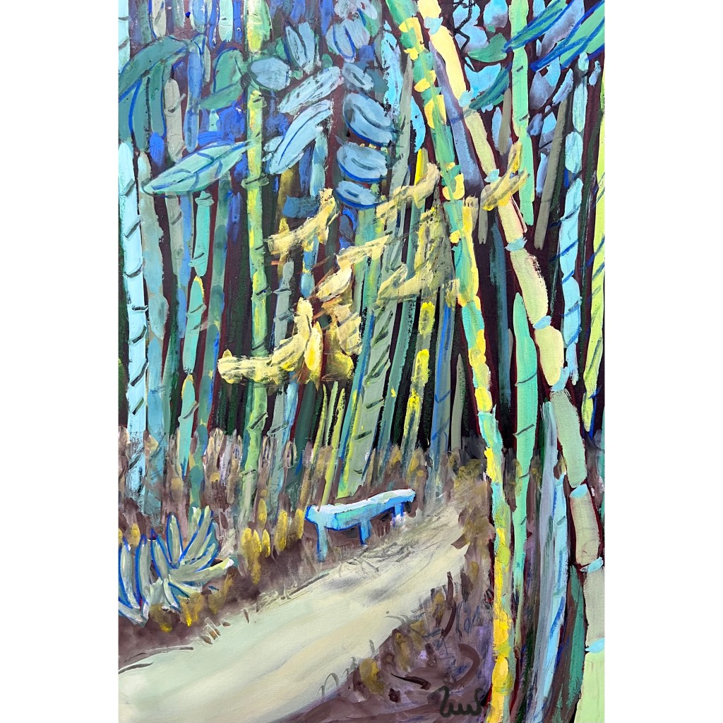 We had out-of-town visitors of the gardening sort, which led to a delightful afternoon at the Encinitas Botanical Garden. The path through the tall bamboo grove is one of the garden’s highlights. We rested in the shade and appreciated the bamboo’s deep greens and undertones of blue and yellow.