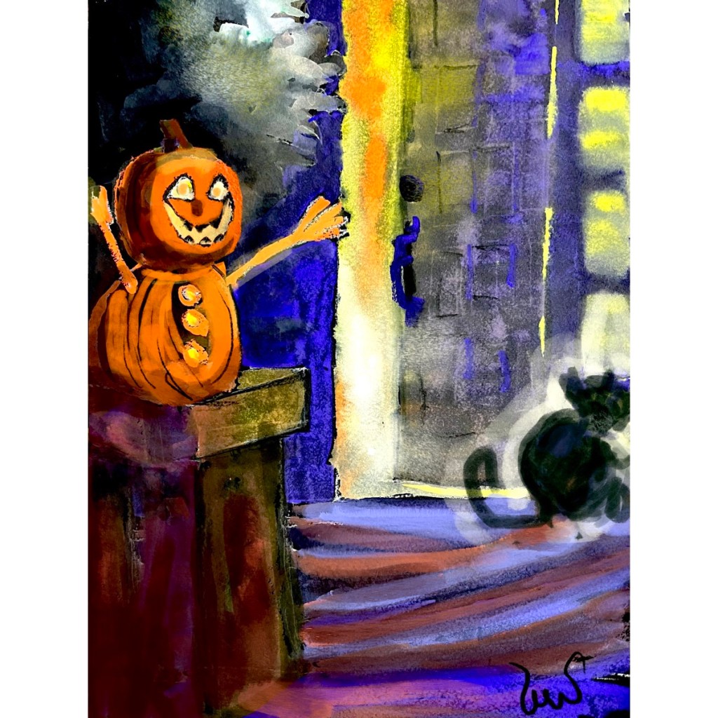 We made pumpkin people tonight by stacking two pumpkins, one for the head and one for the belly, and forks for the arms and hands. They were so cute that I had to paint them. Then, with a little help from Procreate, I added the cat, who believes this is his home.