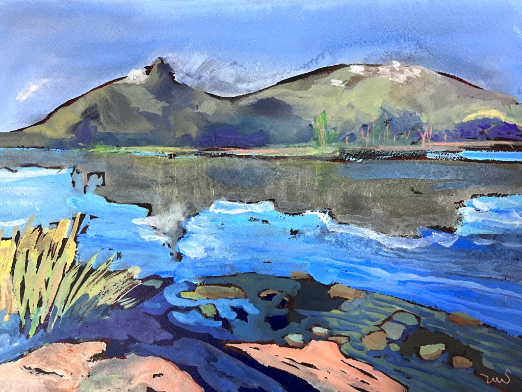 Lake Murray is part of the San Diego Mission Trails Regional Park and a great place to walk, bike, and paint. Every direction has a beautiful view, but the view looking west from the boat launch area may be my favorite.