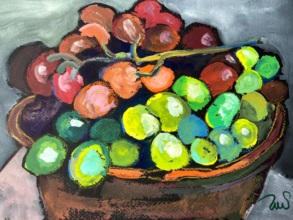 We had large, lovely grapes in a bowl for our Tuesday night Zoom still-life subject. I liked how the artist who set it up arranged the grapes with a gentle diagonal between the green and red grapes.