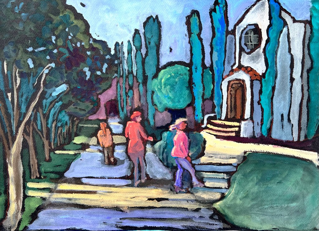 Thursday, our plein air group painted at Liberty Station, the former Naval Training Center in San Diego. It is a large complex with tree-lined promenades, old Spanish-style buildings, and large open fields where recruits once learned to march. I chose this view with the walkway, trees, and the North Chapel because it shows some of the key characteristics of the old training grounds.