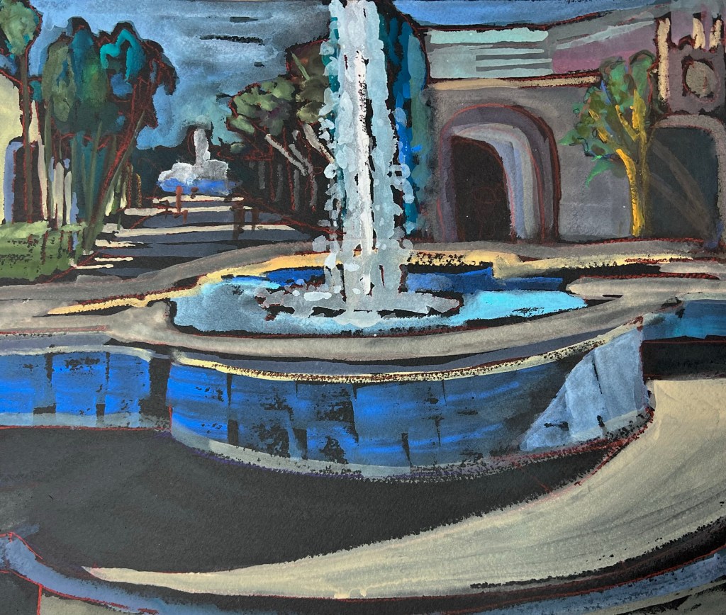 Our Thursday Morning plein air group met at the Plaza de Panama in Balboa Park. Recently, I noticed this view with a pedestrian walkway connecting the two fountains. It was on my mind as a potential painting and was even nicer this morning with its long, deep shadows.