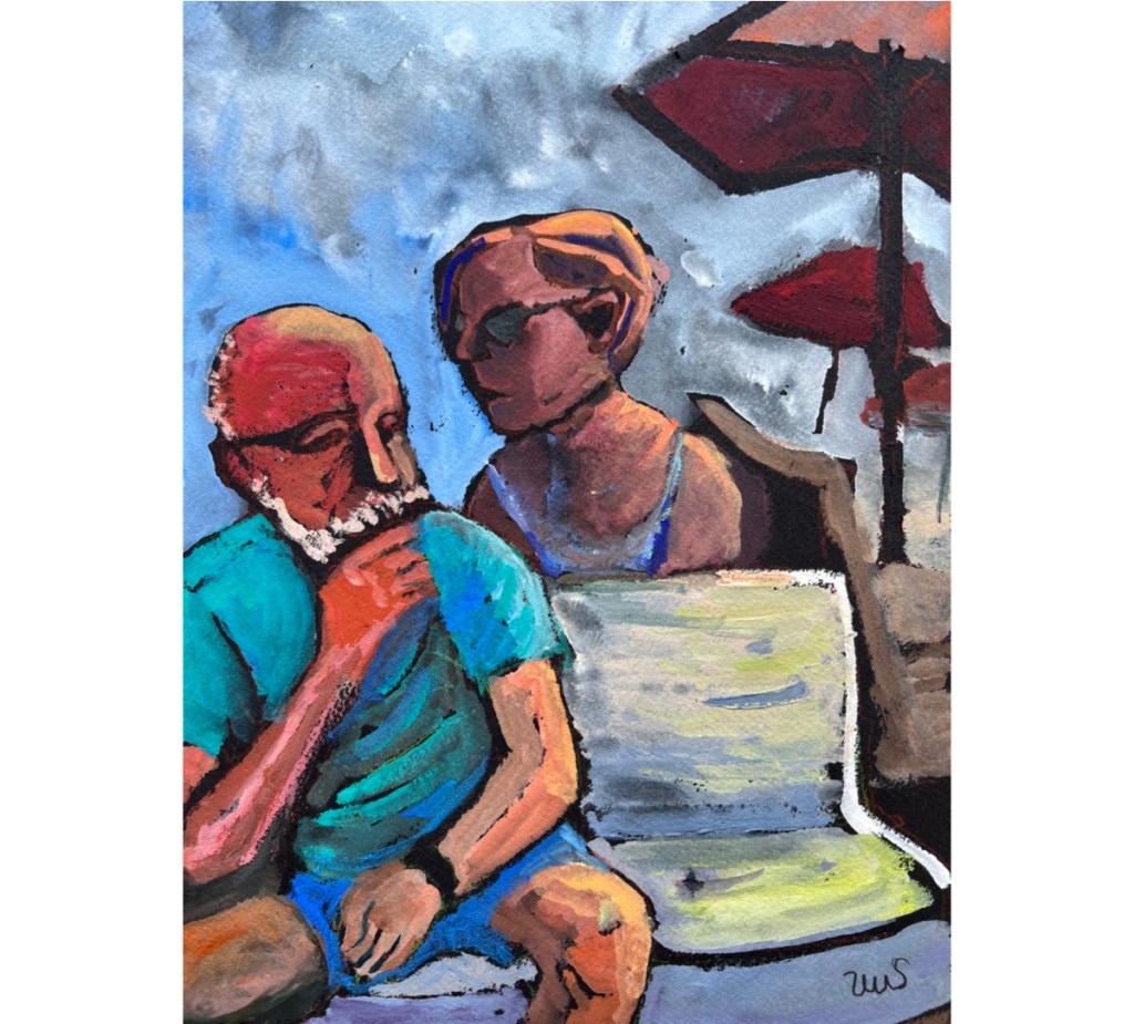 I was just sketching, collecting what was in front of me onto a single page. First one figure, then a second at 90 degrees to the first, then sky, umbrellas, chairs, sand, and finally, a bit of the sea.