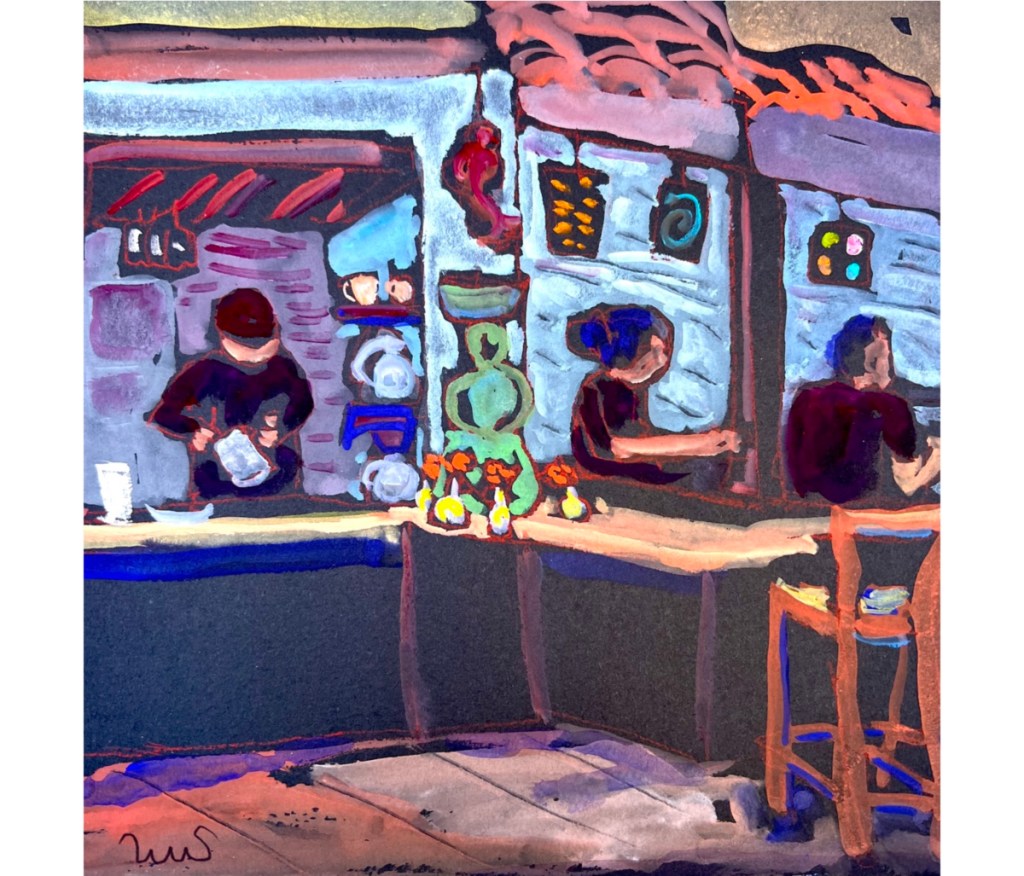 A leisurely breakfast while sketching delights me, and San Pancho is the perfect place for this indulgence. The Cielo Rojo, a few blocks from where we are staying, is full of art, color, movement, and good food. I wanted to capture some of its charm in this sketch.