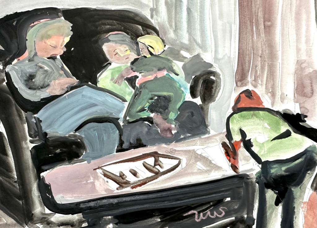We have been delighted to have three generations of my husband’s cousins in town for their spring break. Despite our rain, they have maintained an ambitious schedule for themselves. They have already been to the zoo, taken the ferry to Coronado Island, visited the ships at the Maritime Museums, enjoyed the Mission Trails Nature Center, played at La Jolla Shores, admired the seals at the Children’s Pool Beach, and stayed up too late playing games and talking with us. But their pace caught up with them this afternoon when they sat on the couch while the six-year-old and I drew. Since I always appreciate models who hold still, I took advantage of their exhaustion and made these three sketches of the cousins on the couch.