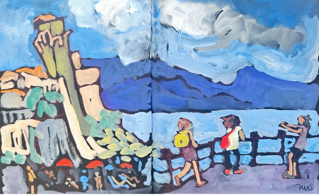 Today we visited an Italian town, Cetara. The sun was bright, the sea inviting, there was a breeze, and it was a glorious summer day. While I sat in the shade sketching, three young women came along and exclaimed over the view. They were so enthusiastic it lifted my spirits even more, and I was glad to capture some of their feelings for this sketch.