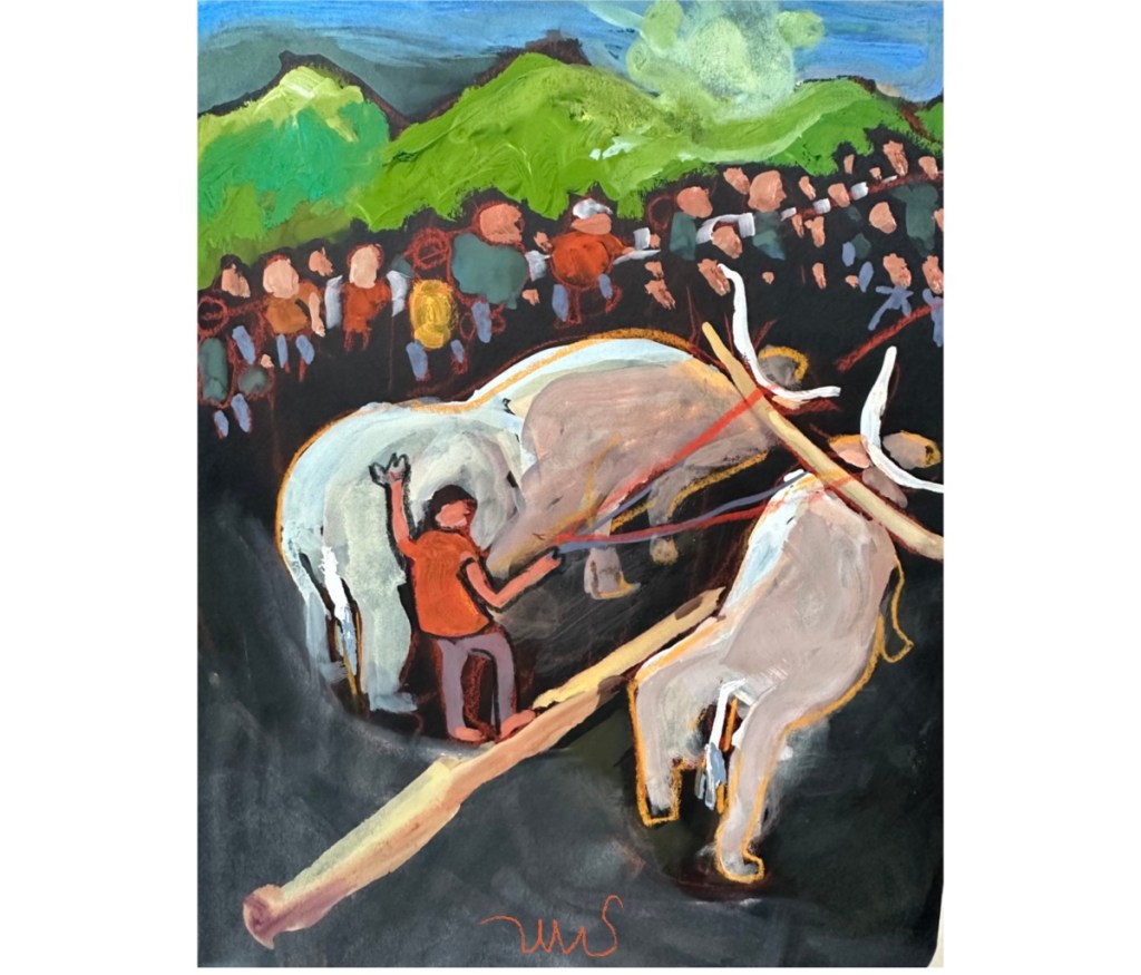I made two sketches the first evening from our balcony. This first shows one of the villagers with his oxen team. The second shows a portion of the parade below us as it progressed to the church.
