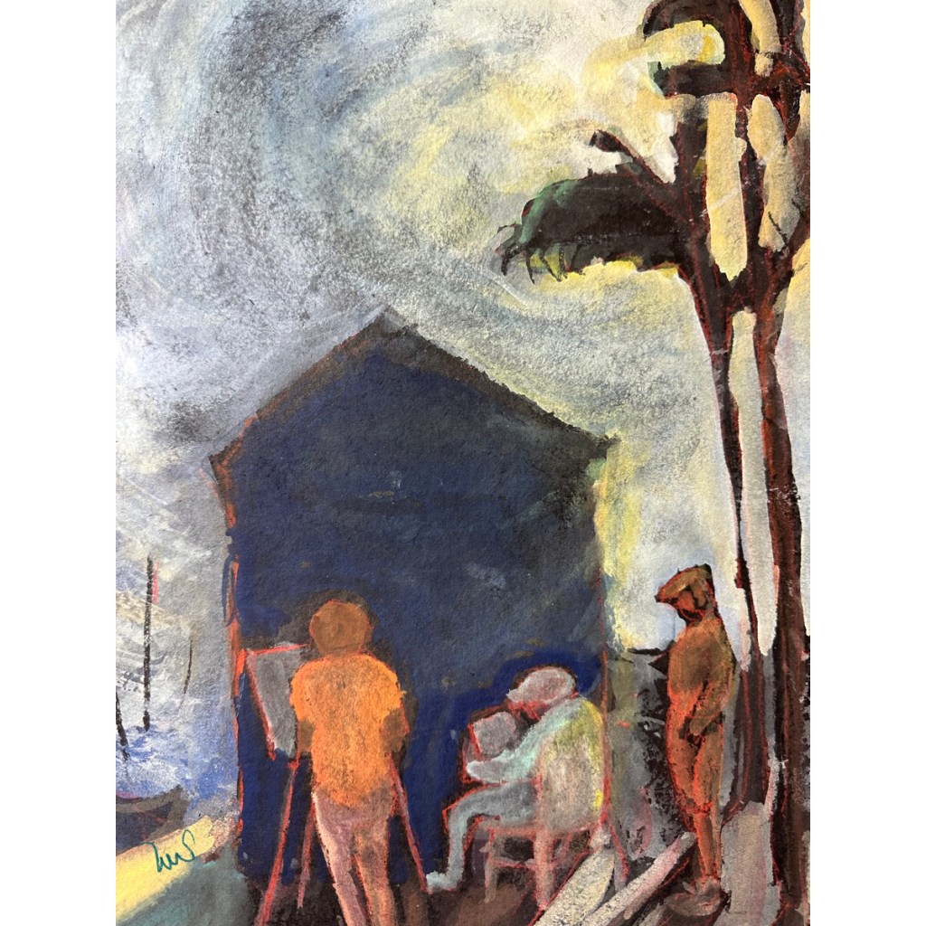 The Oceanside Plein Air Festival ended its fifth day with a harbor paint-out. It was still hot when we started, and a few painters took shelter in the shade of a building. I liked the contrast between the bright sky and the backlit building.