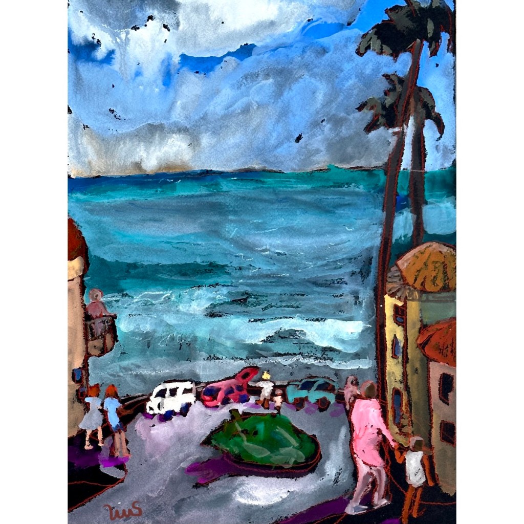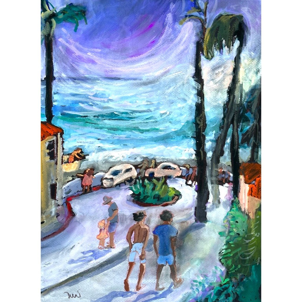 I sketched twice this week from the corner of Surfrider Way and North Pacific Street in Oceanside. The steep street gives a good view of the roundabout where beachgoers unload their gear. I used a 15 x 22-inch sheet of paper and liked that I had room for lots of people within the landscape.