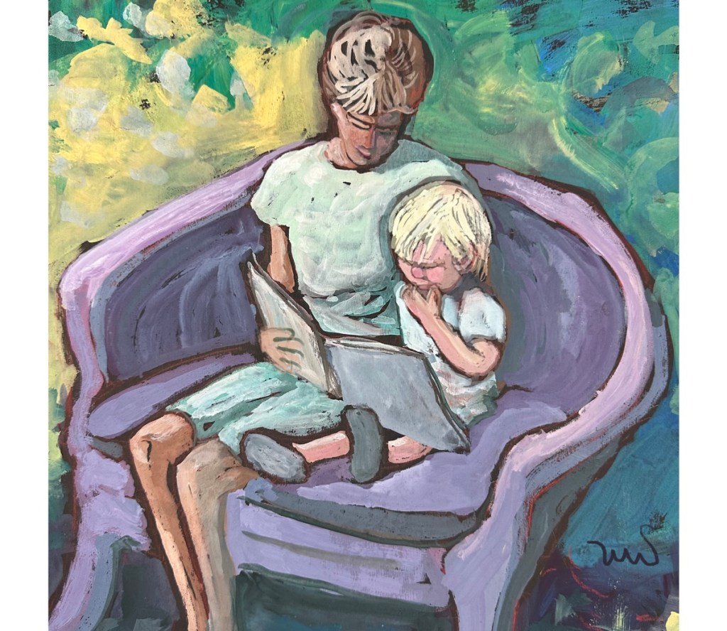 One of my goals is to learn to paint using photo reference, so when I visited my sister, I went nuts snapping photos of her adorable grandkids. I liked this one because the two figures were in identical positions, and the two facial expressions were similar as well. I think these similarities made it easier to show their shared delight in reading a picture book together.