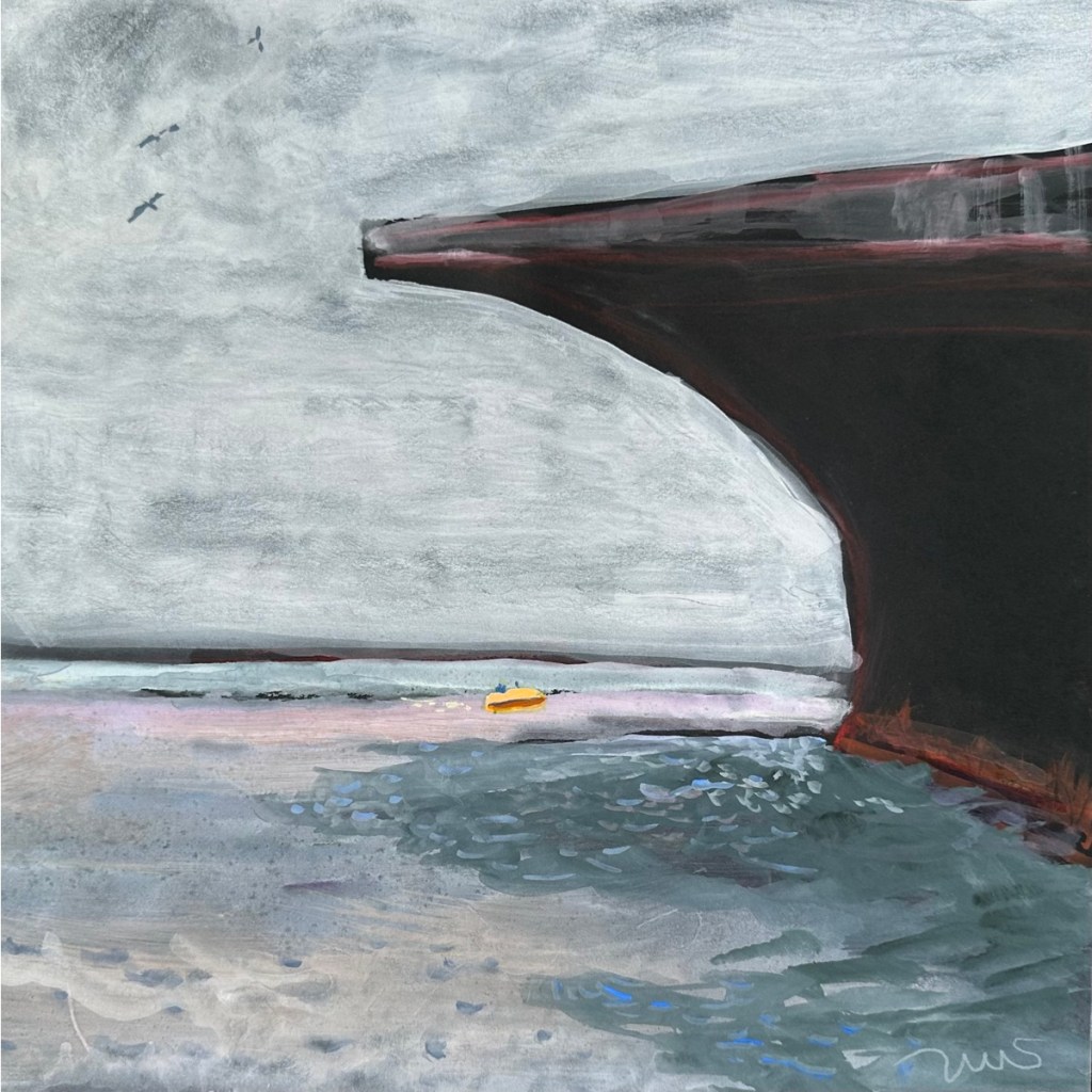 I liked the contrast of the ship’s hull to the small vessels on the bay, especially to this small yellow boat.