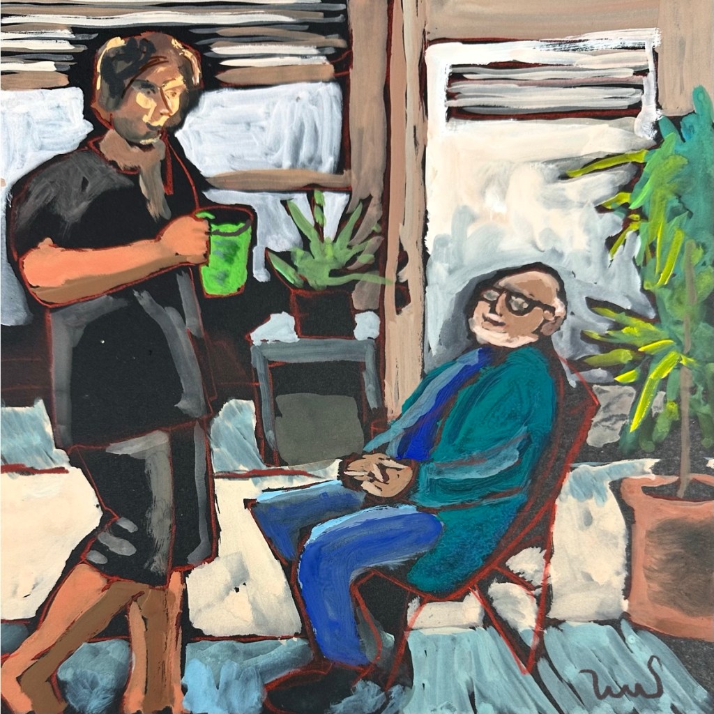 We had a hectic visit with our son and his beloved in the Bay Area. I only did a few sketches while we were there, mostly line drawings with a red pastel pencil on black bristol paper. Now that I am home, I am adding gouache to some of them. I like this scene because it is a role reversal of the days when we had to be inventive about getting our kids to eat healthy foods.