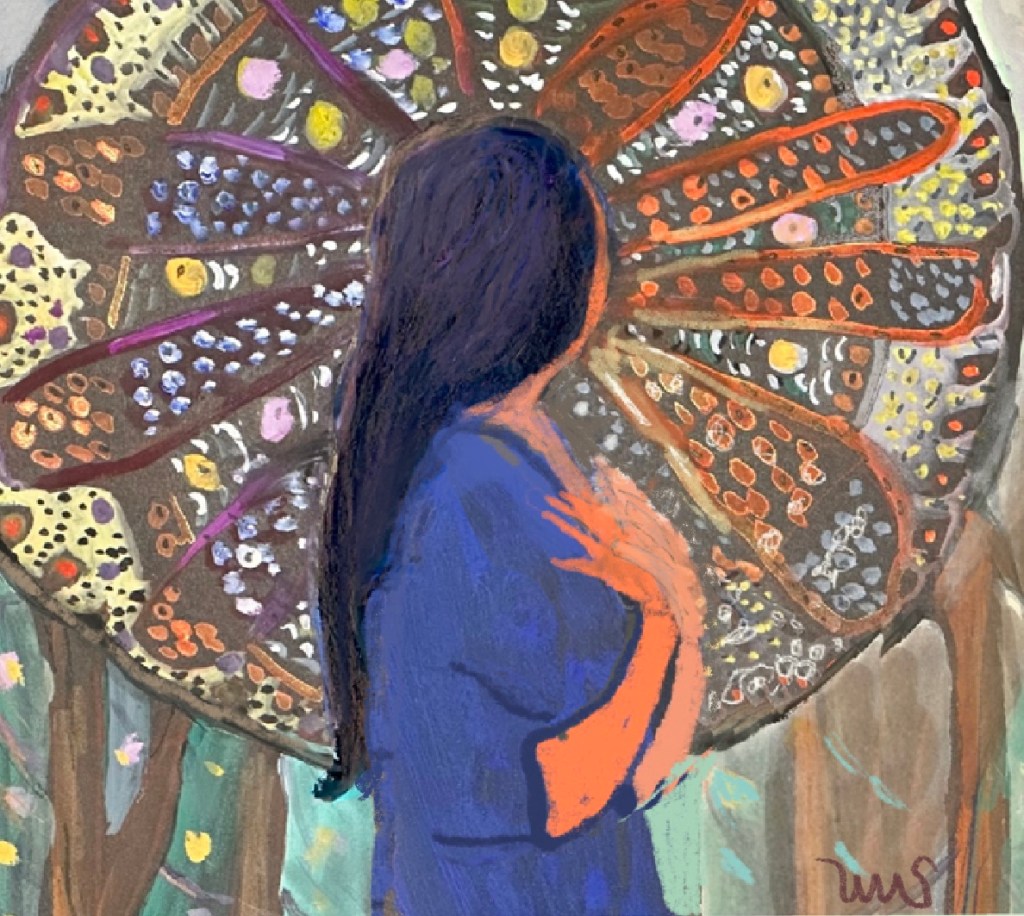 Initially, I put in a grey background similar to what we saw, but it did not communicate a reason for the woman’s reaction. Over the subsequent weeks, I slowly built a geometric butterfly-like background over the flat gouache with gouache, ink, color pencils, and markers. I like this better because it suggests why the woman is responding to the moment.