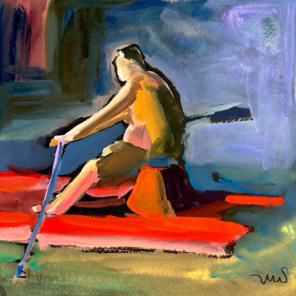 I used a photo from this past summer of people paddling about in rented boats because the colors were so bright, and I thought it would be a good reference for tonight. I like this sketch but need to go darker and more abstract if I want to paint in David Park’s style.