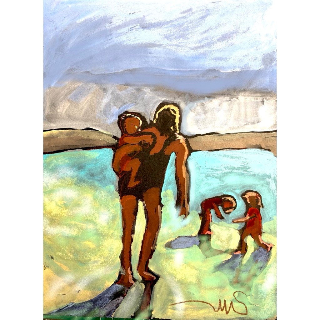 Twenty minutes before our group meeting, I abandoned the painting I was working on and quickly blocked out this sketch. After looking at the wonderful work from our group and seeing how the others handled the light, I went home and reworked this little sketch, adding much brighter color to the landscape and highlighting the figures.