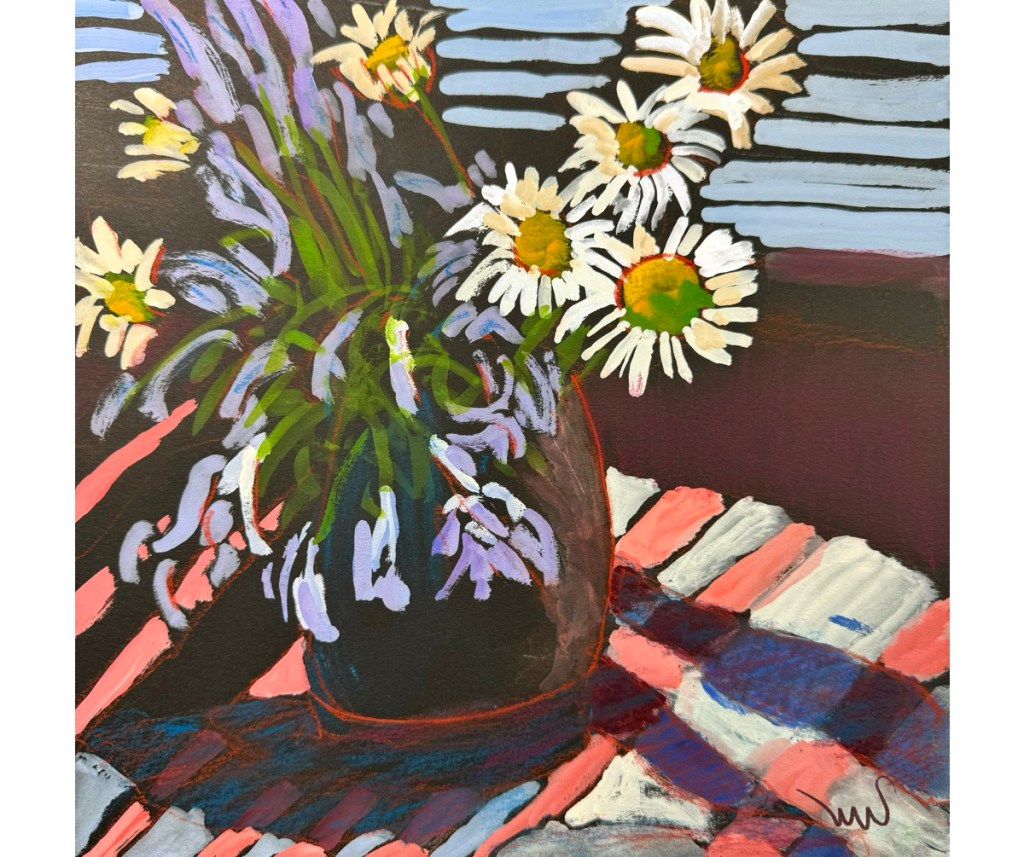 The artist who set up our still life for our Tuesday night Zoom group this week has an eye for stripes, which works well for gouache on black paper.