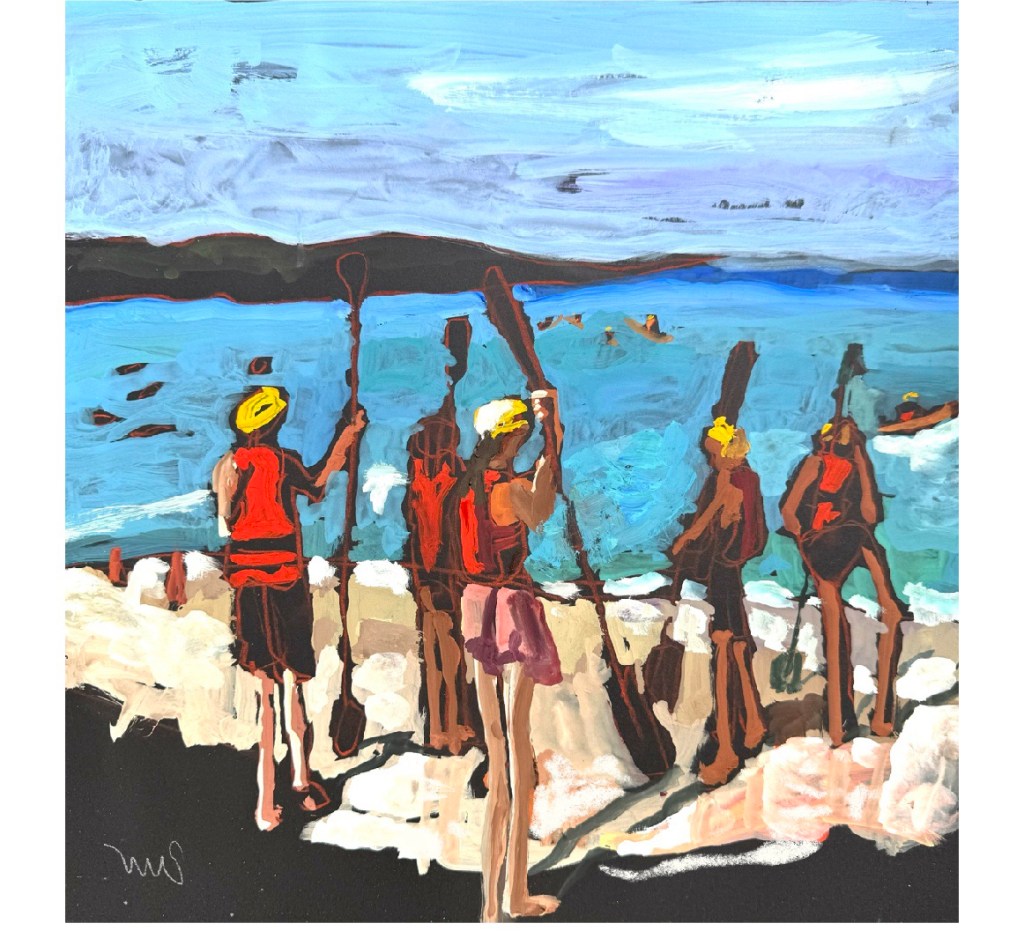 Something locals and tourists enjoy in the San Diego area is kayaking along the caves of the La Jolla Ecological Reserve and Underwater Park. You can rent a kayak and go out with a guide for a few hours. Last Thursday, I painted several groups of people waiting to kayak to the caves and back. I liked the patterns the figures and paddles made against the sky, sea, and sand.