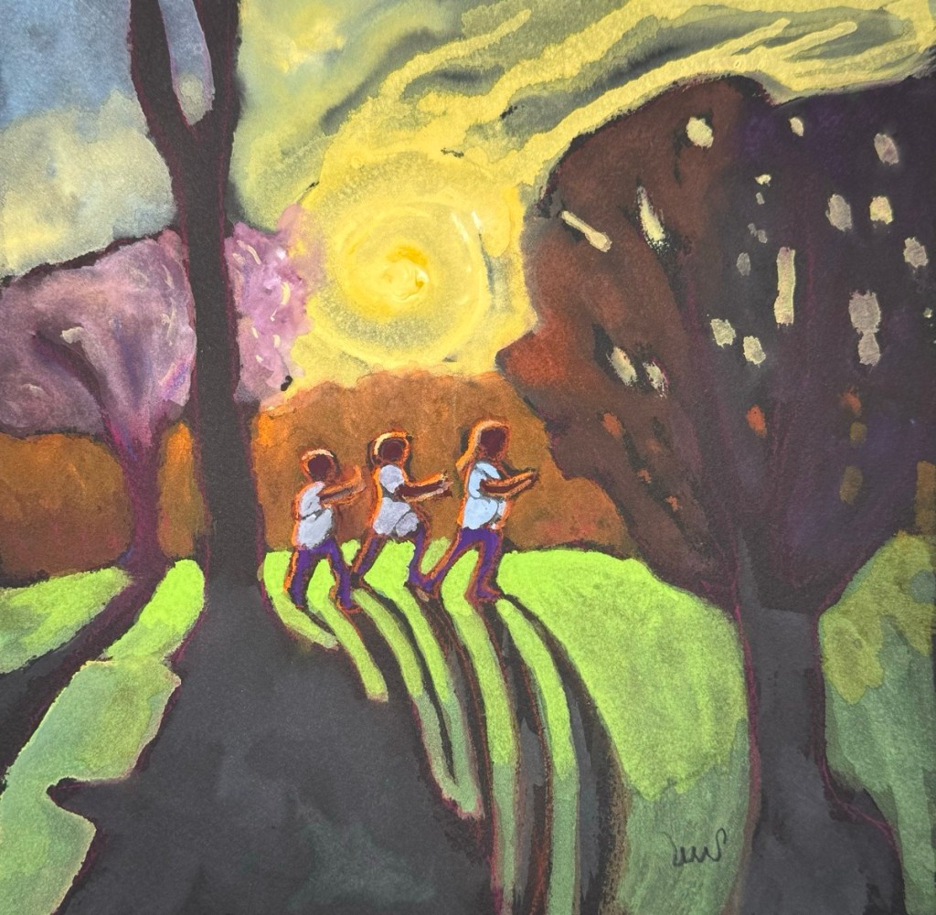 A few days ago, I posted ‘Tai Chi at Sunset’. Yesterday, I made a second version. I am not sure which of the two I prefer. I wanted to say something about group exercise in the park at sunset, and the first post captures the peace of Tai Chi with its calmer colors. However, in today’s piece, the undulating movement of Tai Chi is mimicked in the figure’s shadows and sky in the second, and I like this effect too.