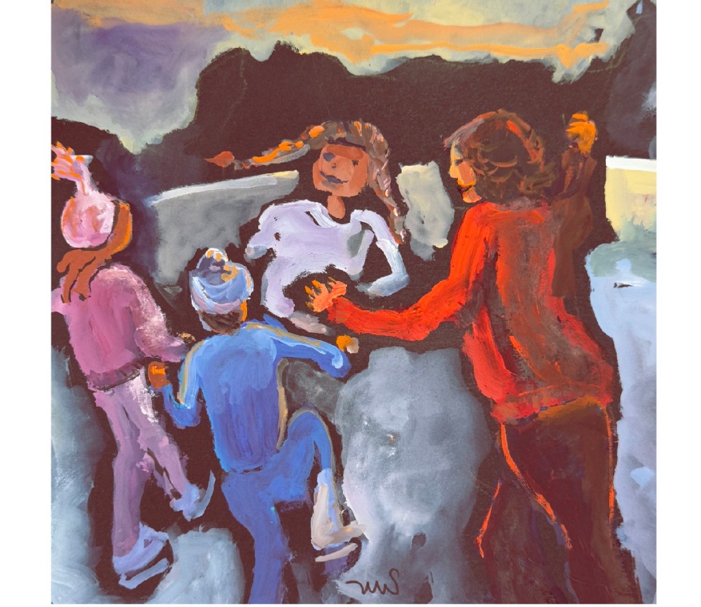 The San Diego Watercolor Society plein air painters met yesterday evening to capture the excitement of ice skating on a December night. It was a busy place with too much to choose from. Eventually, I narrowed in on the little skaters. I loved their excitement and marveled at how quickly they recovered from spills. I wanted to capture their joy of skating late on a Saturday night.