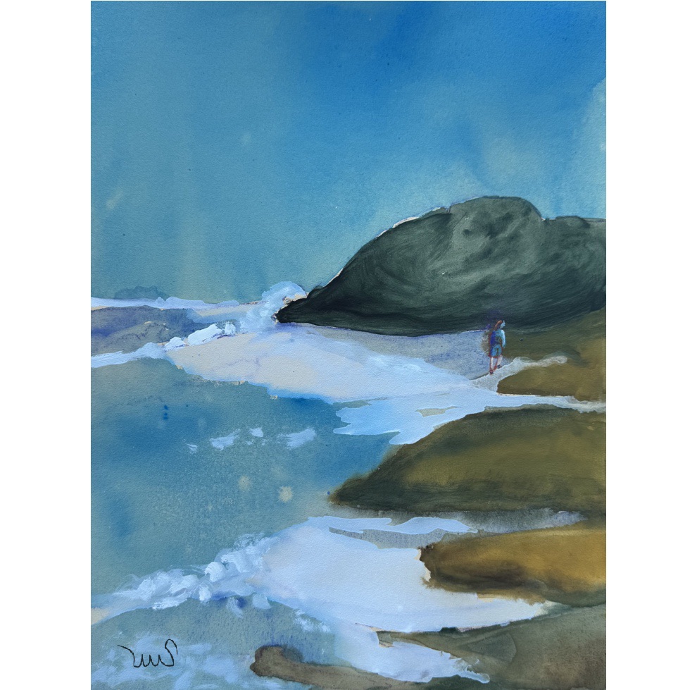 Early morning beach walks are a delightful part of a seaside vacation. This one is a gouache painting on a 9 x 12 Colourfix sheet of pastel paper.